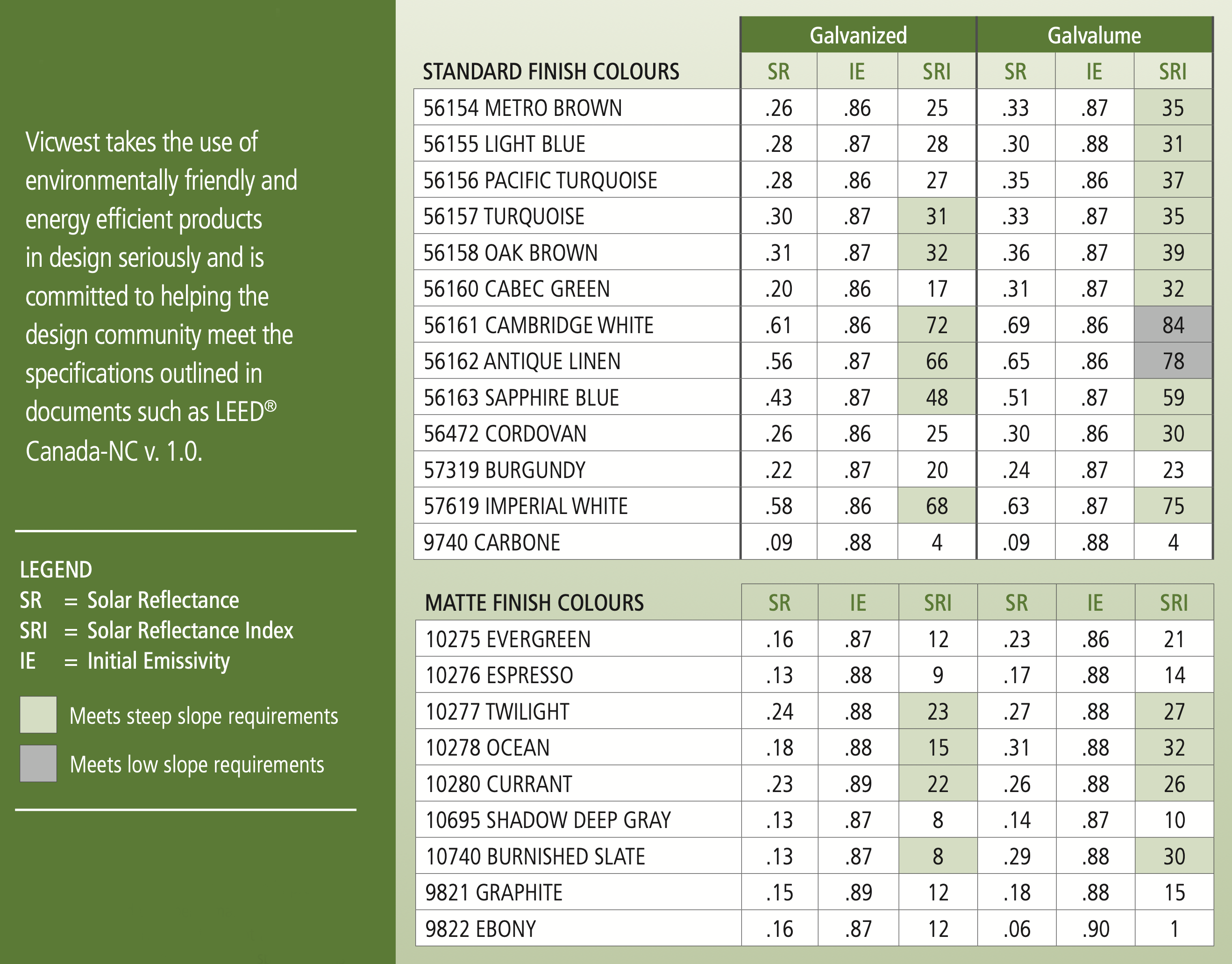 For the greatest energy savings a white or lighter colour metal roof will reflect the most solar rays and reduce heat transference. The industry standard for this is the solar reflectance index (SRI) and is on a scale from 1- black reflects absorbs almost all light to 100 which would reflect all light. Select the link below to view VicWest's complete colour collection with SRI ratings.